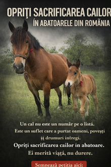 Opriți sacrificarea cailor în abatoare în România!Calul nu a fost făcut pentru a ajunge în abator. De sute de ani, calul a fost alături de om la munca pământului, în agricultură, la transport și în gospodării. Pentru asta a fost crescut, pentru asta a fost respectat: ca ajutor, nu ca hrană. În România, cai sănătoși, apți de muncă și de viață, ajung să fie sacrificați doar pentru că nu și-au mai găsit stăpân sau pentru că sistemul permite această practică. Considerăm că acest lucru este profund greșit din punct de vedere moral și inacceptabil într-o societate care se vrea civilizată. Un animal sănătos nu trebuie omorât. Lipsa unui stăpân nu poate fi o sentință la moarte. Caii pot fi folosiți în mod normal și etic: • în munci agricole ușoare și tradiționale • în gospodării • în activități educative, terapeutice sau turistice Există alternative. Sacrificarea nu este una dintre ele. Faptul că animale blânde, inteligente și iubitoare ajung în abatoare este rezultatul lipsei de responsabilitate, nu al unei necesități reale. Normalizarea acestei practici ne îndepărtează de valorile umane de bază: respectul pentru viață și compasiunea. 🔴 Cerem autorităților: 1. Interzicerea sacrificării cailor sănătoși pentru consum 2. Recunoașterea calului ca animal de muncă și partener al omului, nu ca animal de hrană 3. Crearea și susținerea alternativelor etice: adopție, centre de protecție, programe agricole și sociale 4. Controale stricte și transparente privind soarta cailor abandonați Caii ne-au ajutat o viață întreagă. Este rândul nostru să îi protejăm.9 din 100 SemnăturiInițiat de Anamaria-Sorina Bizadea