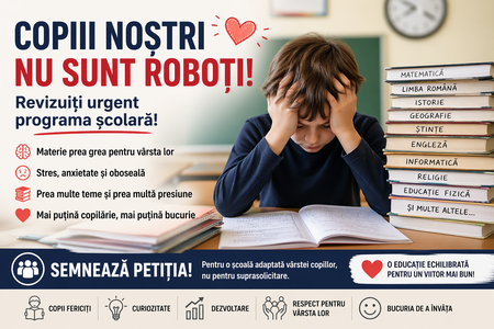 Noi, părinți, bunici, profesori și cetățeni preocupați de viitorul copiilor din România, cerem revizuirea urgentă a programei școlare.